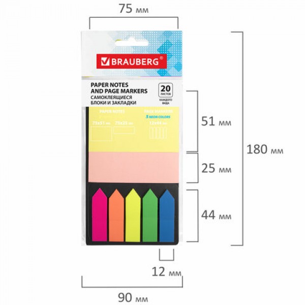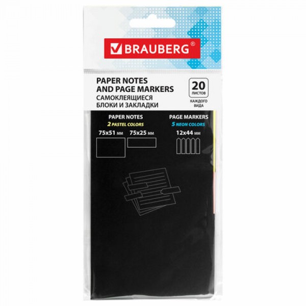 Блок (стикер) и закладки клейкие BRAUBERG, НАБОР 51х75 мм и 25х75 мм + закладки 12х44 мм, 20 листов, 122730