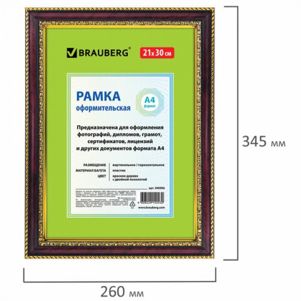 Рамка 21х30 см,небьющаяся, багет 30 мм, BRAUBERG 'HIT4', красное дерево с двойной позолотой, 390996