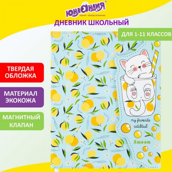 Дневник 1-11 класс 48 л., кожзам (твердая), магнитный клапан, ЮНЛАНДИЯ, 'Котик', 106562