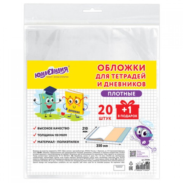 Обложки ПЭ для тетрадей и дневников, НАБОР 20 шт. +1 шт., ПЛОТНЫЕ, 110 мкм, 210х350 мм, прозрачные, ЮНЛАНДИЯ, 274106
