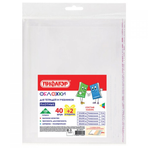 Обложки ПП для тетрадей и учебников, КЛЕЙКИЙ КРАЙ, НАБОР 40 + 2 шт. в ПОДАРОК, ПЛОТНЫЕ, 100 мкм, ПИФАГОР, 274117