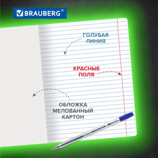 Школьная тетрадь BRAUBERG с синей обложкой, изготовленной из импортного мелованного картона. Подходит для всех видов пишущих принадлежностей, включая шариковые, гелевые, капиллярные и перьевые ручки: написанное на одной стороне не просвечивается на другой