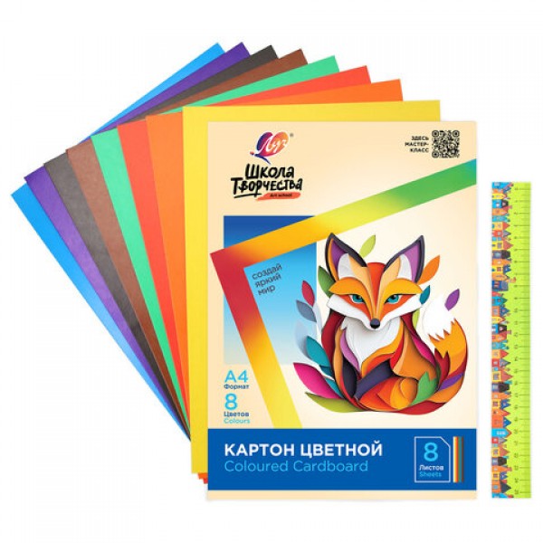 Картон цветной А4 МЕЛОВАННЫЙ, 8 л., 8 цветов, в папке, ЛУЧ 'Школа творчества', 210х297 мм, 30С 1794-08
