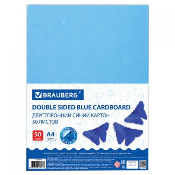 Картон цветной А4 ТОНИРОВАННЫЙ В МАССЕ, 50 листов, СИНИЙ, 220 г/м2, BRAUBERG, 210х297 мм, 128983