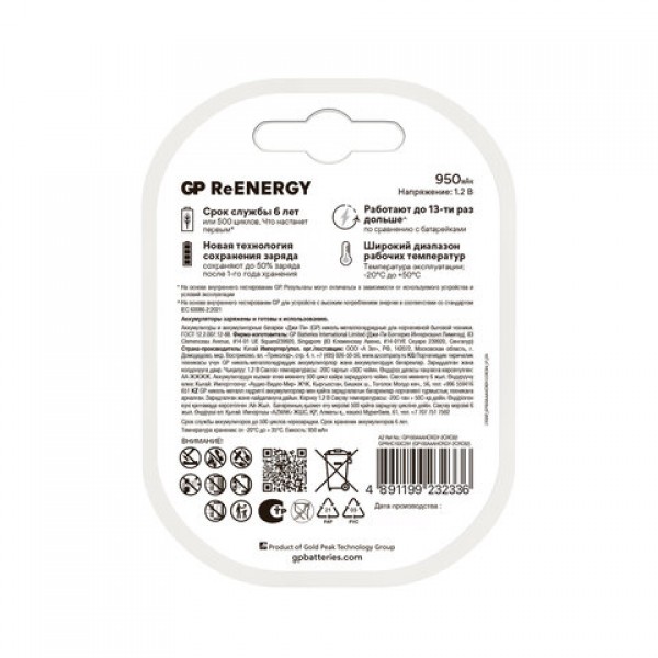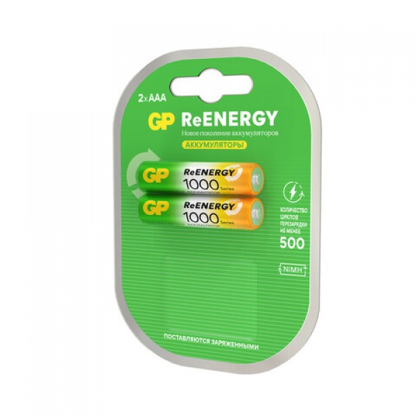 Батарейки аккумуляторные GP ReEnergy Ni-Mh мизинчиковые КОМПЛЕКТ 2 шт., ААА (HR03), 950 mAh, 100AAAHCRGY, 100AAAHCRGY-2CR