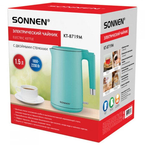 Чайник электрический с двойными стенками SONNEN KT-8719M, 1,5 л, 2200 Вт, мятный, 454694