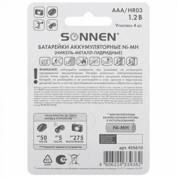 Батарейки аккумуляторные Ni-Mh мизинчиковые КОМПЛЕКТ 4 шт., AAA (HR03) 1000 mAh, SONNEN, 455610