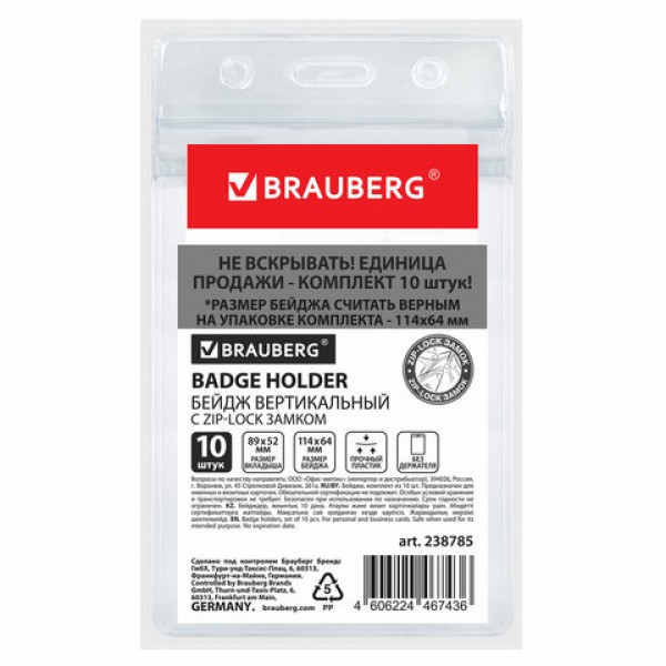 Бейдж вертикальный с ZIP-LOCK-замком (89x52 мм), КОМПЛЕКТ 10 шт., без держателя, BRAUBERG, 238785