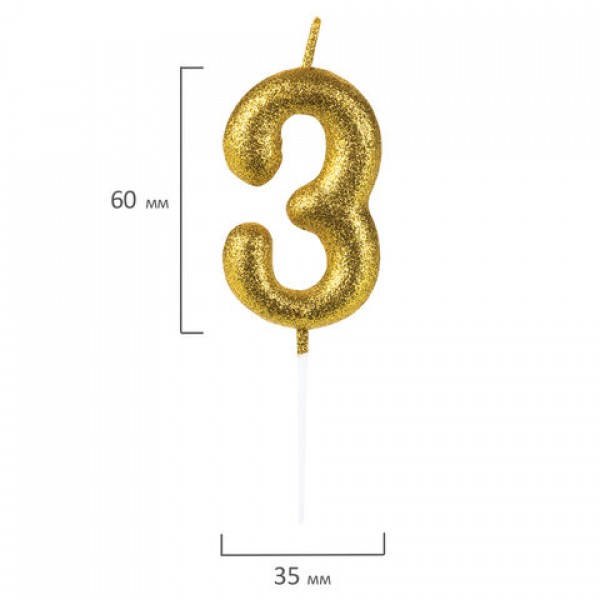 Свеча-цифра для торта '3' золотая с глиттером, 6 см, ЗОЛОТАЯ СКАЗКА, на шпажке, в блистере, 591416