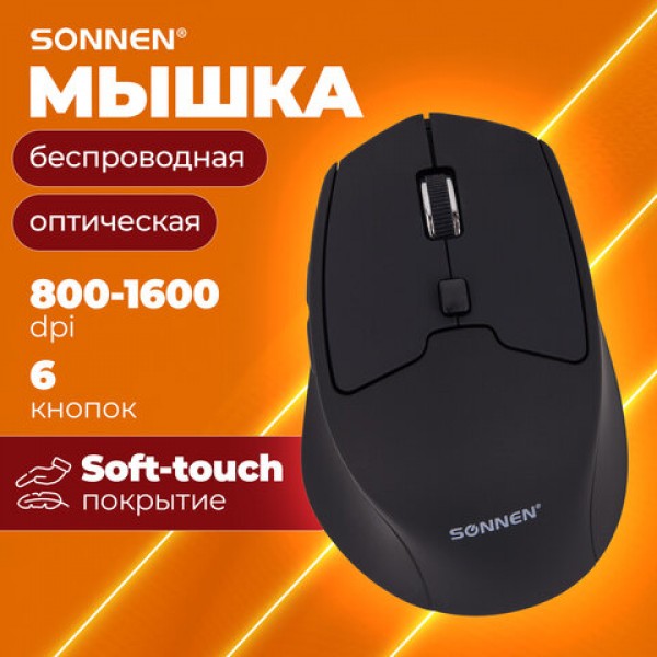 Мышь беспроводная SONNEN V33, USB, 800/1200/1600 dpi, 6 кнопок, оптическая, черная, SOFT TOUCH, 513517