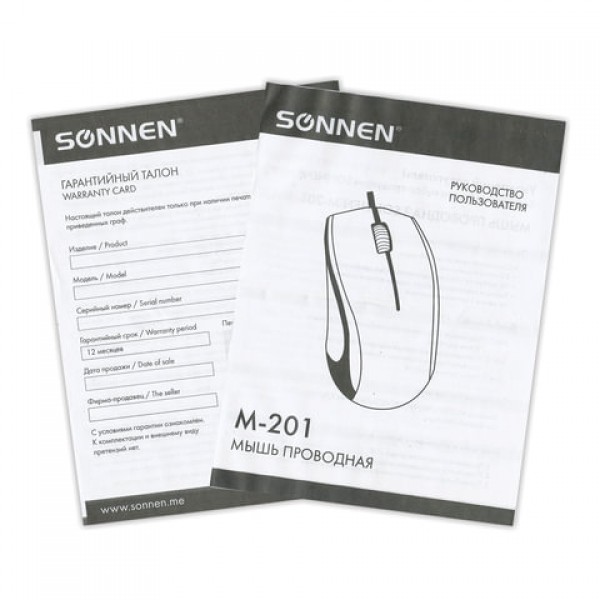 Мышь проводная SONNEN М-201, USB, 1000 dpi, 2 кнопки + колесо-кнопка, оптическая, черная, 512631