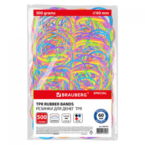 Резинки банковские TPR универсальные, диаметр 60 мм, 500 г, ЯРКИЕ ЦВЕТА, BRAUBERG SPECIAL, 440193