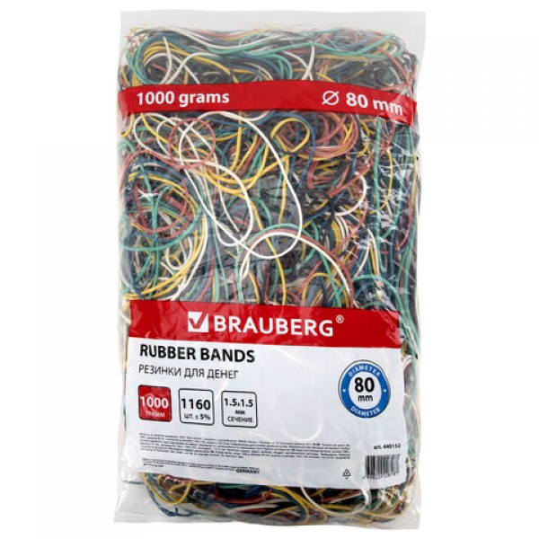 Резинки банковские универсальные диаметром 80 мм, BRAUBERG 1000 г, цветные, натуральный каучук, 440152