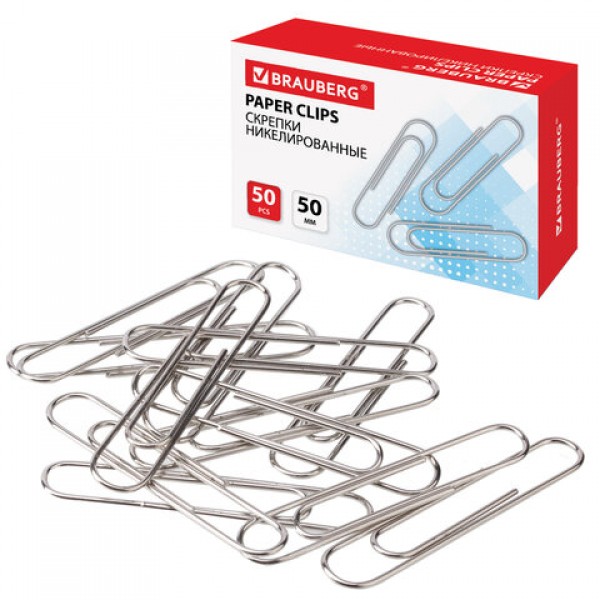 Скрепки большие 50 мм, BRAUBERG, никелированные, 50 шт., в картонной коробке, РОССИЯ, 221525