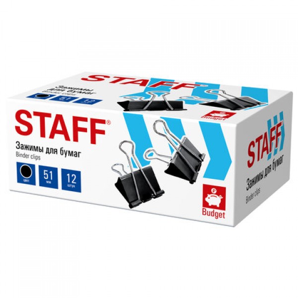 Зажимы для бумаг БОЛЬШИЕ STAFF ECO, КОМПЛЕКТ 12 шт., 51 мм, на 230 листов, черные, картонная коробка, 274035