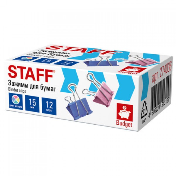 Зажимы для бумаг STAFF ECO, КОМПЛЕКТ 12 шт., 15 мм, на 45 листов, цветные, картонная коробка, 274036