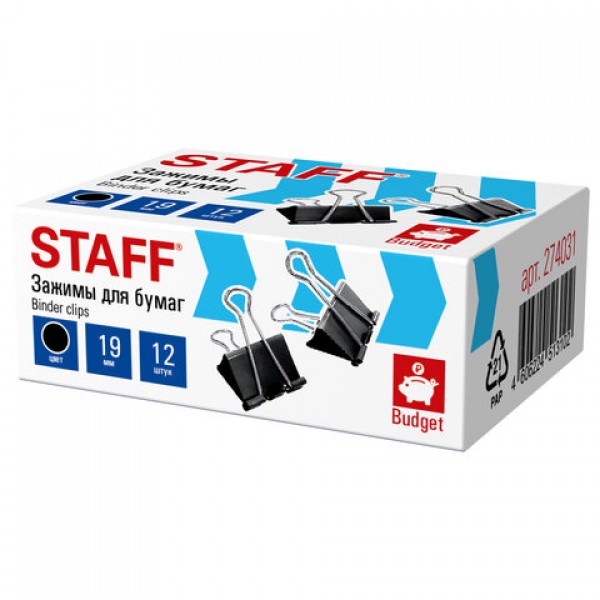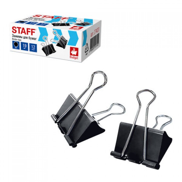 Зажимы для бумаг STAFF ECO, КОМПЛЕКТ 12 шт., 19 мм, на 60 листов, черные, картонная коробка, 274031