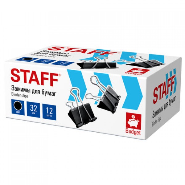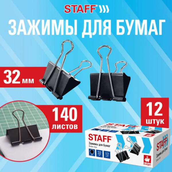 Зажимы для бумаг STAFF ECO, КОМПЛЕКТ 12 шт., 32 мм, на 140 листов, черные, картонная коробка, 274033