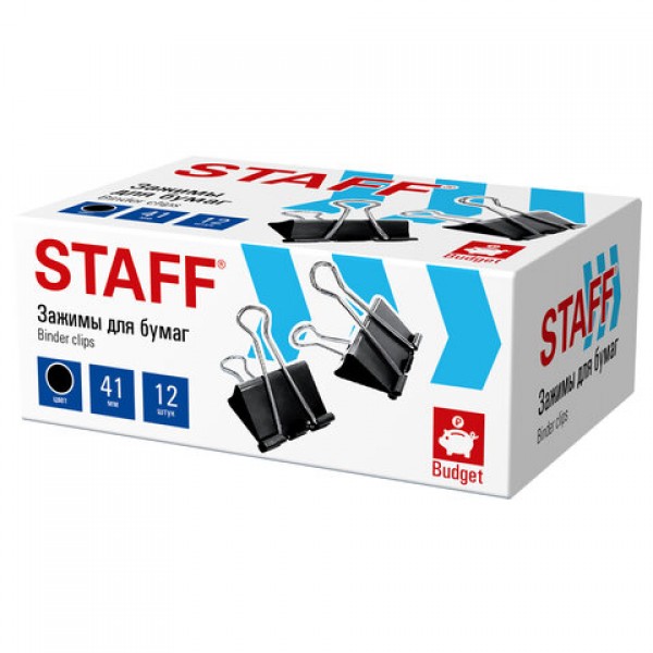 Зажимы для бумаг STAFF ECO, КОМПЛЕКТ 12 шт., 41 мм, 200 листов, черные, картонная коробка, 274034