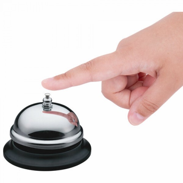Компактный хромированный звонок на пластиковом основании. Для привлечения внимания персонала в офисах, гостиницах на стойках ресепшн.
