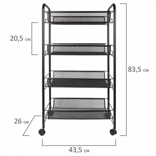 Этажерка (тележка) BRABIX офисно-бытовая 4 яруса, на колесах, металл, черная, 43,5х26х83,5 см, 603753