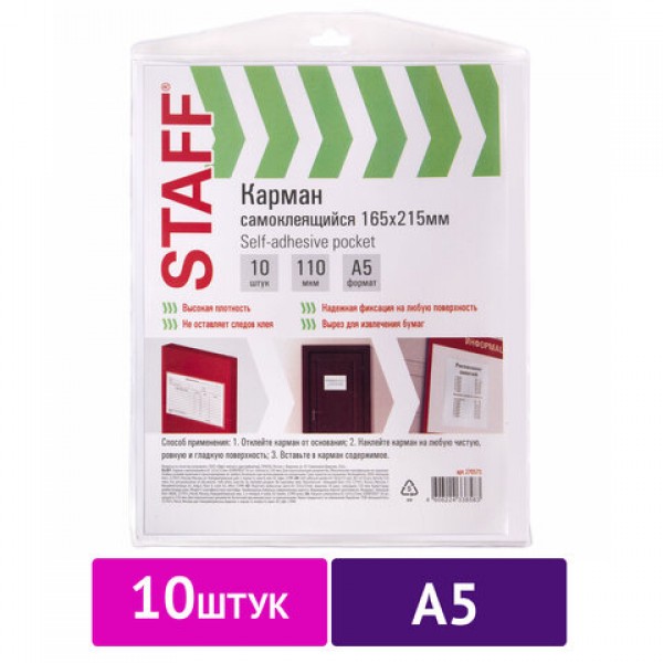 Карманы самоклеящиеся на любую поверхность ФОРМАТ А5 165х215 мм, КОМПЛЕКТ 10 шт., STAFF, 270571