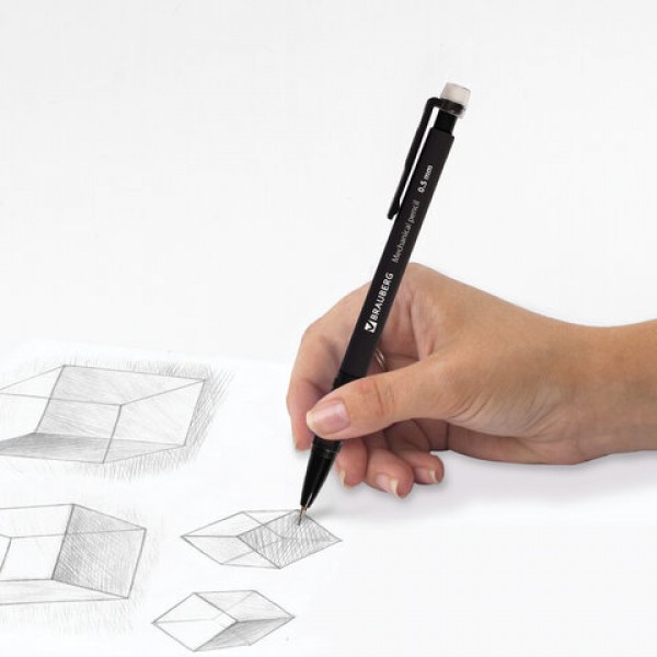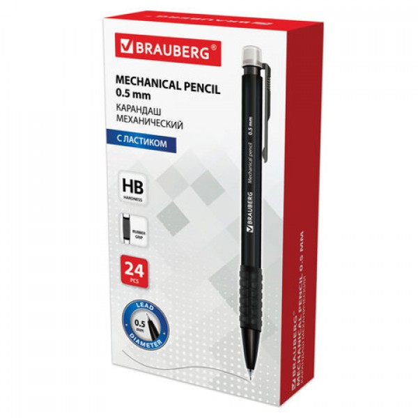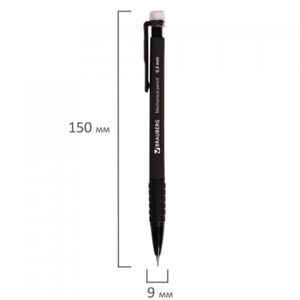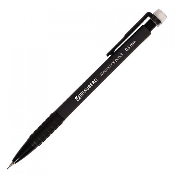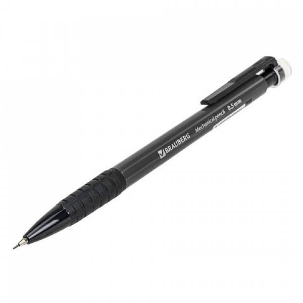 Механический карандаш BRAUBERG "Comfort" с корпусом черного цвета и удобным резиновым упором, исключающим скольжение пальцев во время письма.