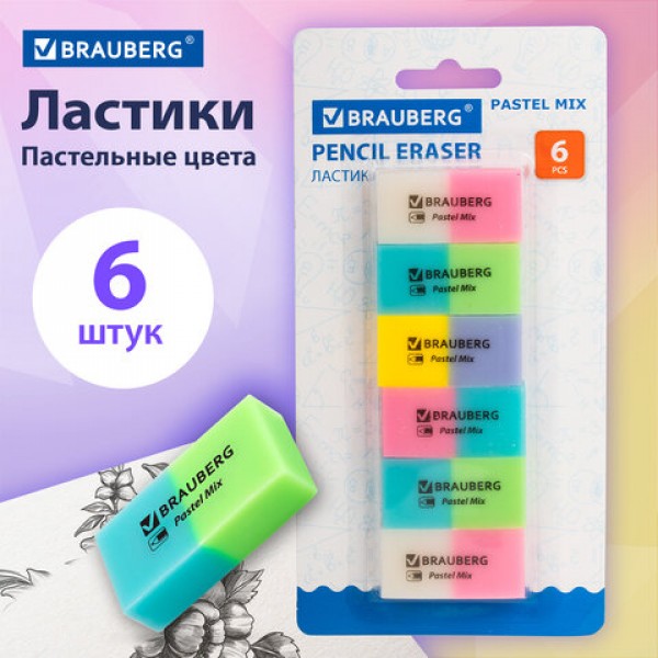 Набор ластиков BRAUBERG 'Pastel Mix', 6 шт., цвета ассорти, 44х21х10 мм, экологичный ПВХ, 229597