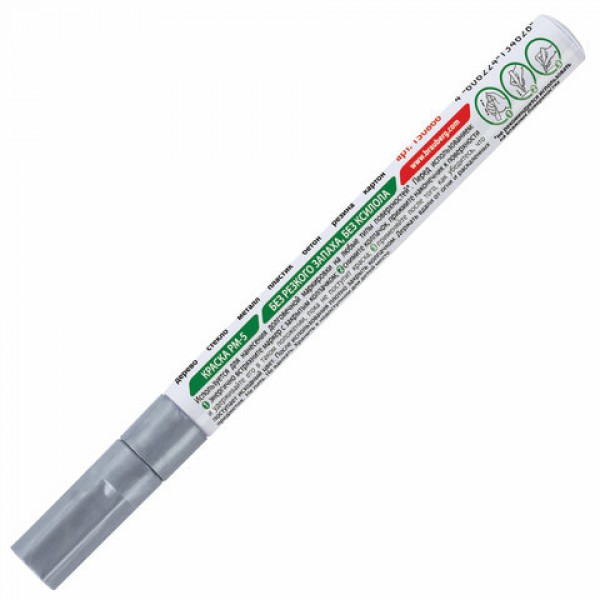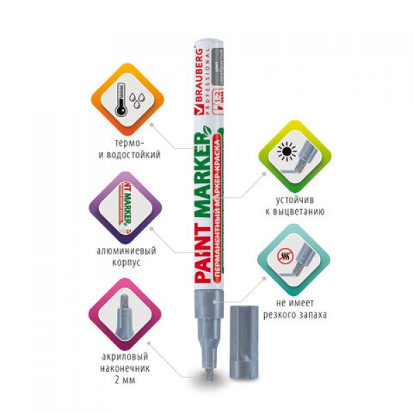 Маркер-краска лаковый (paint marker) 2 мм, СЕРЕБРЯНЫЙ, БЕЗ КСИЛОЛА (без запаха), алюминий, BRAUBERG PROFESSIONAL, 150866