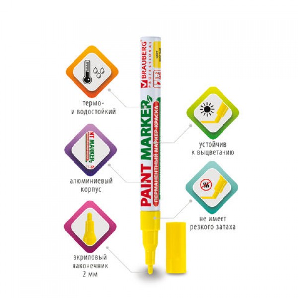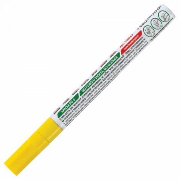 Маркер-краска лаковый (paint marker) 2 мм, ЖЕЛТЫЙ, БЕЗ КСИЛОЛА (без запаха), алюминий, BRAUBERG PROFESSIONAL, 150863