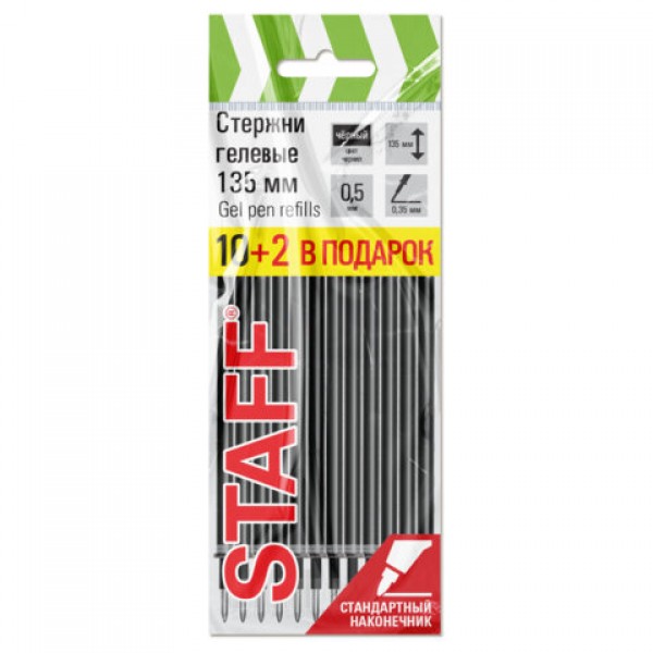 Стержни гелевые STAFF, 135 мм, НАБОР 10 шт + 2 шт в ПОДАРОК, ЧЕРНЫЕ, стандартный наконечник, узел 0,5 мм, линия письма 0,35 мм, 170411