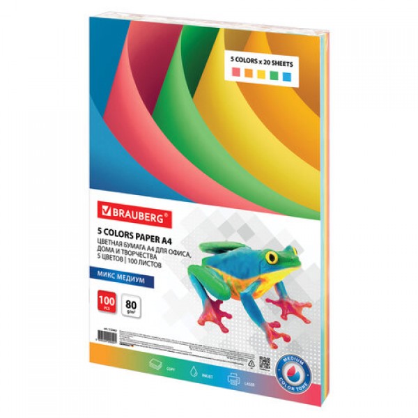 Бумага цветная BRAUBERG, А4, 80 г/м2, 100 л. (5 цветов х 20 листов), медиум, для офисной техники, 112462