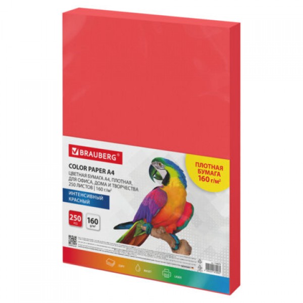 Бумага цветная ПЛОТНАЯ BRAUBERG, А4, 160 г/м2, 250 л., красная, интенсив, для печати, творчества, 116672
