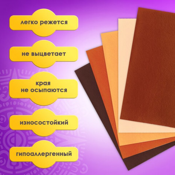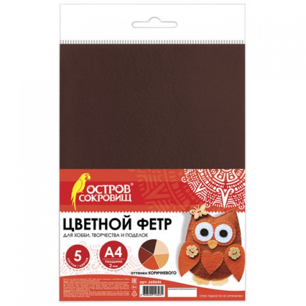 Цветной фетр МЯГКИЙ А4, 2 мм, 5 листов, 5 цветов, плотность 170 г/м2, оттенки коричневого ОСТРОВ СОКРОВИЩ, 660646