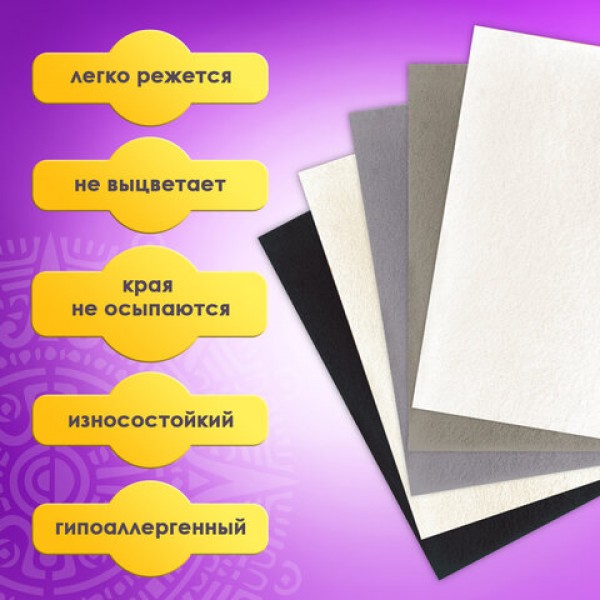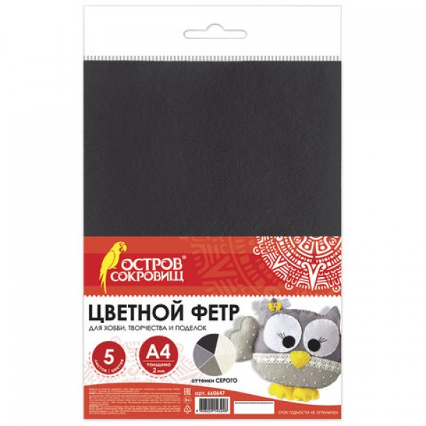 Цветной фетр МЯГКИЙ А4, 2 мм, 5 листов, 5 цветов, плотность 170 г/м2, оттенки серого, ОСТРОВ СОКРОВИЩ, 660647