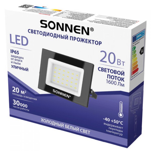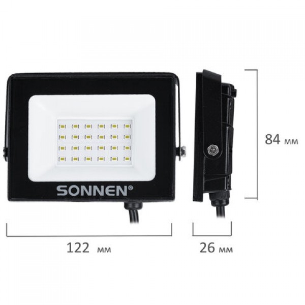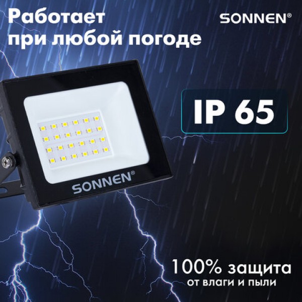 Прожектор светодиодный 20 Вт, 6500 К, 1600 Лм, 20 м2, IP65, 122x84x26 мм, черный, SONNEN, 238412