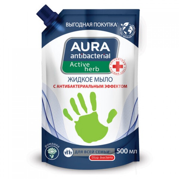 Мыло жидкое антибактериальное для всей семьи 500 мл, AURA АНТИБАКТЕРИАЛЬНАЯ 'Ромашка', дой-пак, 10510