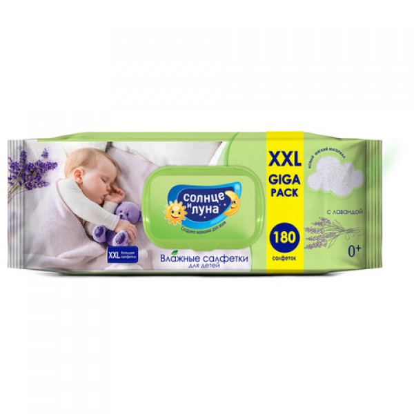 Салфетки влажные детские 180 шт., СОЛНЦЕ И ЛУНА с лавандой, 0+, с пластиковым клапаном, 9920