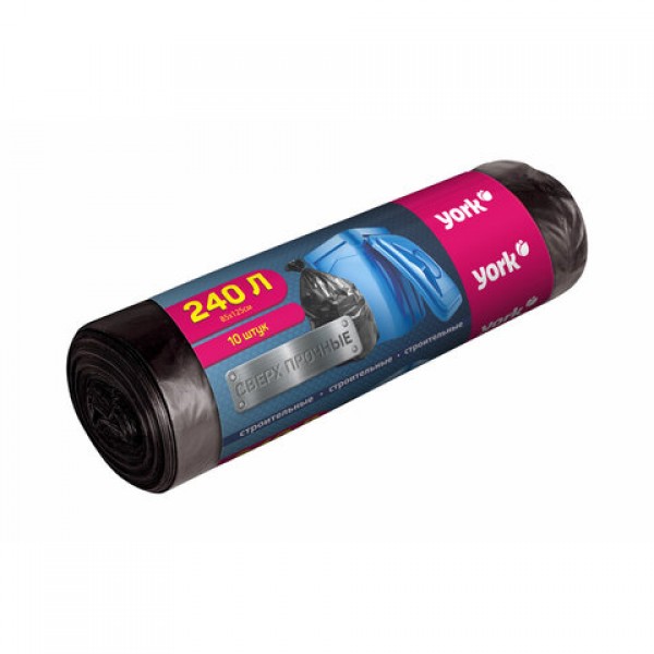 Мешки строительные для мусора 240л, черные, в рулоне 10шт, ПВД, 28мкм, YORK. Очень прочные. Подходят строительного мусора. Удобны для больших баков. Для предприятий, для ремонта, для использования на дачном участке.