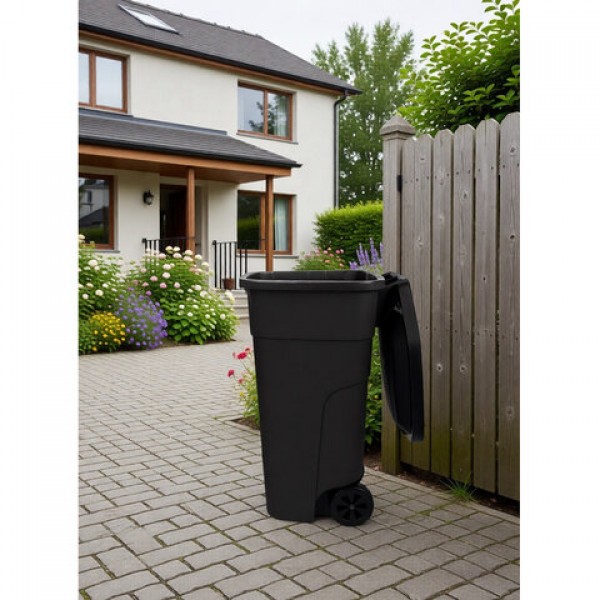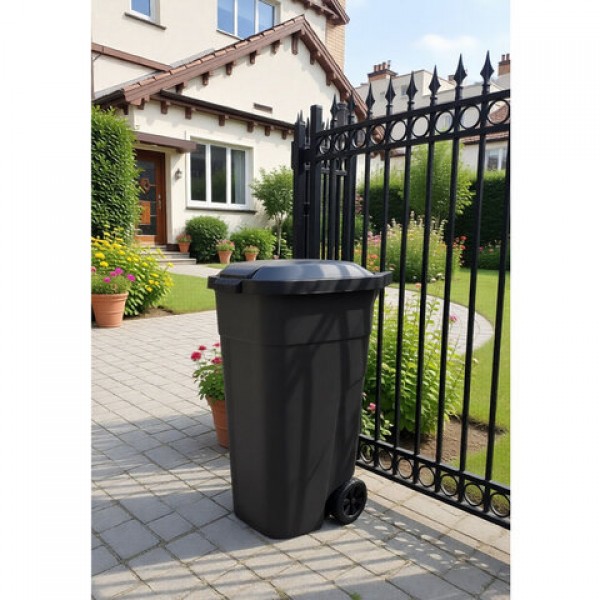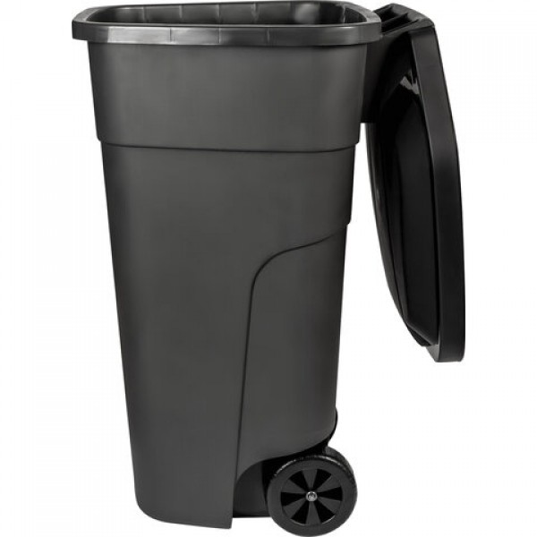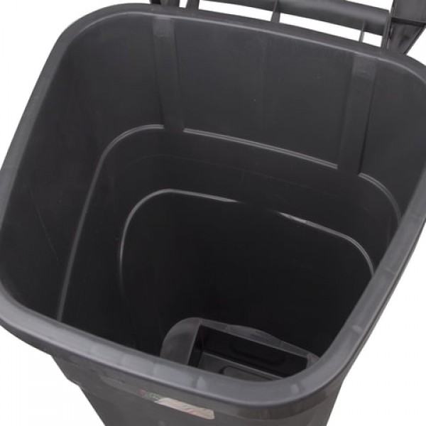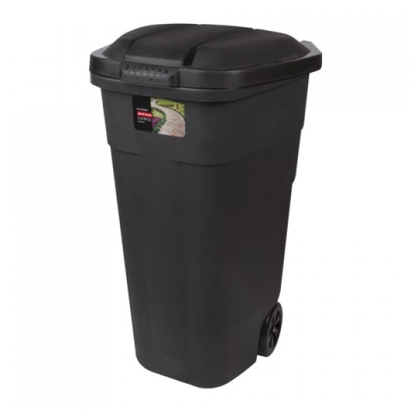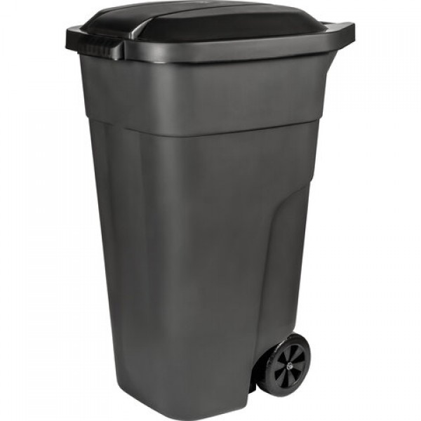 Пластиковый контейнер большой вместимости (110 л) с крышкой для сбора и транспортировки мусора. Удобная ручка и надежные колеса позволяют легко перемещать контейнер. Для внутреннего и наружного использования.