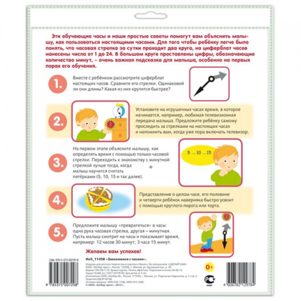 Это наглядное пособие выполнено на высококачественном плотном картоне с пластиковыми, независимо вращающимися стрелками. На обратной стороне изделия даны пошаговые советы для ознакомления малыша с такими понятиями как “часы” и “время”.