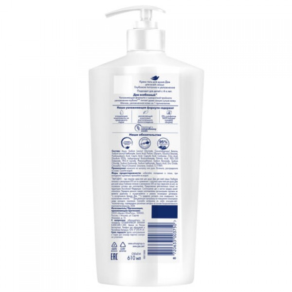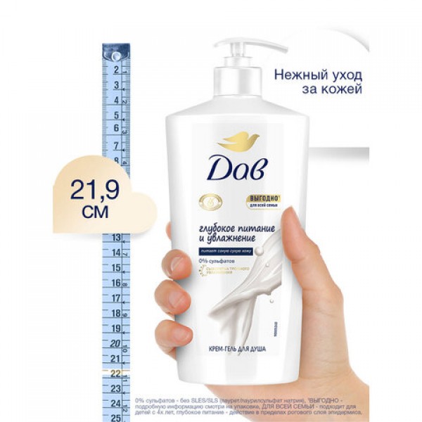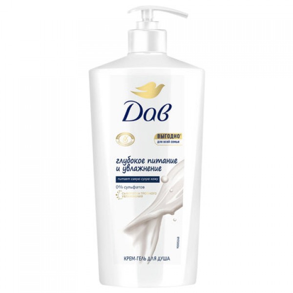 Крем-гель для душа ДАВ "Глубокое питание и увлажнение" интенсивно питает и увлажняет даже самую сухую кожу. Подходит для всей семьи, в том числе детей с 4 лет.