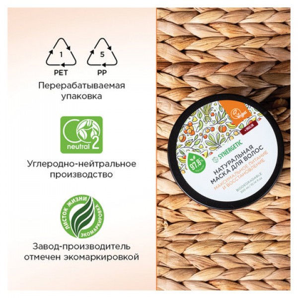 Натуральная маска для волос SYNERGETIC "Максимальное питание и восстановление" комплексно воздействует на волосы и кожу головы и обеспечивает эффективный уход.