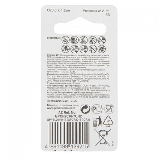 Литиевые батарейки GP размера CR2016 предоставляют высокий выходной уровень, что делает их идеально подходящими для часов, фотографического оборудования, калькуляторов, компьютерного оборудования.
