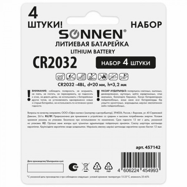 Батарейки литиевые SONNEN Lithium CR2032, 'таблетки, дисковые, кнопочные', КОМПЛЕКТ 4 шт., блистер, 457142