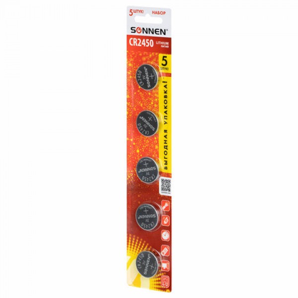 Батарейки литиевые SONNEN Lithium CR2450, 'таблетки, дисковые, кнопочные', КОМПЛЕКТ 5 шт., блистер, 457144