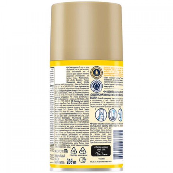 Сменный баллон 269 мл, GLADE 'Сицилийский лимонад и мята', для автоматических освежителей, универсальный, 33705