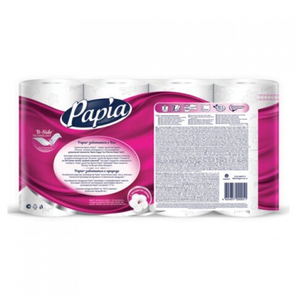 Белая трехслойная бумага PAPIA с экстрактом хлопка необыкновенно мягкая и в то же время прочная. Уникальная технология двустороннего тиснения бумаги обеспечивает лучшую впитываемость и мягкость с обеих сторон.