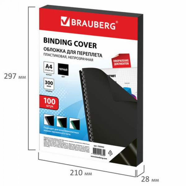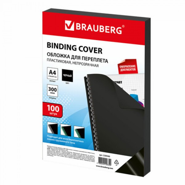 Обложки пластиковые для переплета, А4, КОМПЛЕКТ 100 шт., 300 мкм, черные, BRAUBERG, 530940