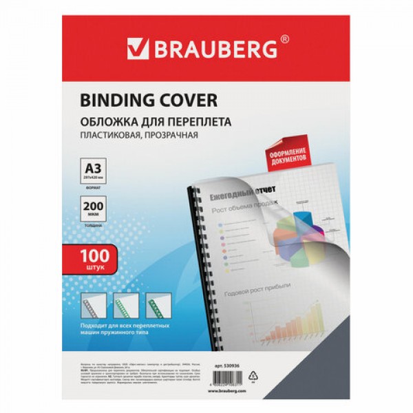 Обложки пластиковые для переплета БОЛЬШОЙ ФОРМАТ А3, КОМПЛЕКТ 100 шт., 200 мкм, прозрачные, BRAUBERG, 530936
